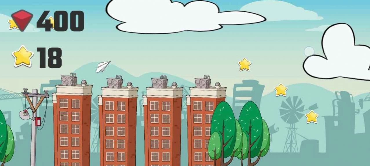 3、游戏场景中城市街景都会化为障碍飞机飞行,用手指上下滑动就能帮助纸飞机飞行。