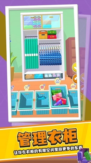 衣柜整理大师,这是一款能让你轻松解压的整理收纳休闲游戏。在游戏里,玩家能够模拟真实的衣服整理过程,收拾那些杂乱无章的衣柜。游戏中存在大量等待玩家整理的衣柜,玩家需要依据不同衣服的特点进行分类,再按对应的位置摆放,只要合理地把衣柜整理得干干净净,就算成功完成关卡挑战。感兴趣的玩家不妨来游戏中体验一番!