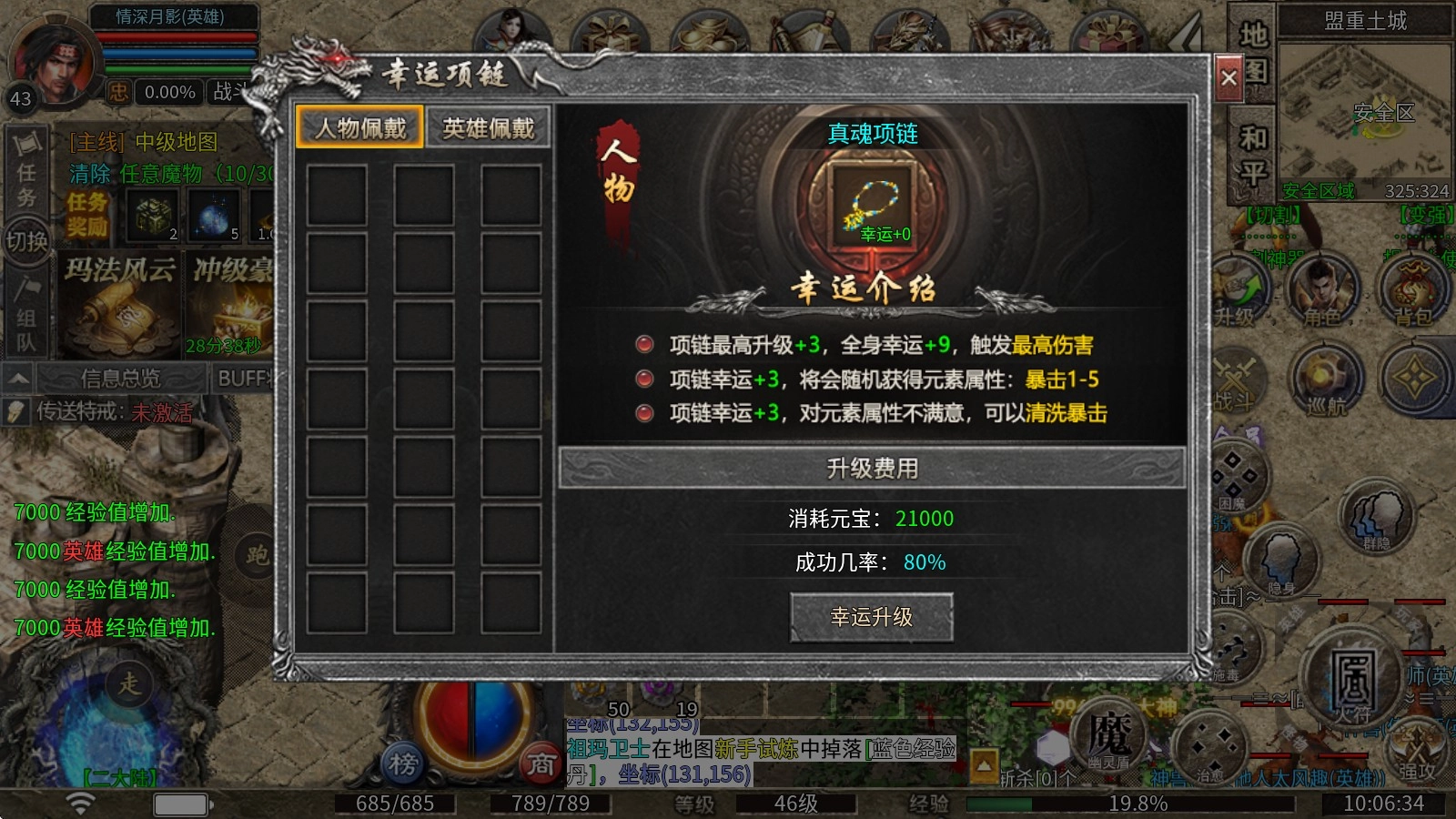 5、幸运项链:项链最高升级+3,全身幸运+9,触发最高伤害,项链幸运+3,将会随机获得元素属性(暴击1-5),对元素属性不满意,可以清洗暴击。
