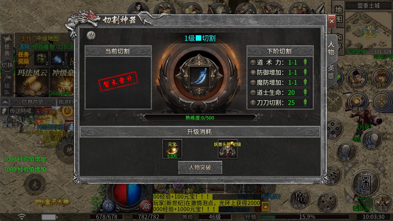 1、切割神器:通过消耗元宝与妖兽头颅来实现晋升,晋升后可提升职业专属属性以及切割伤害。