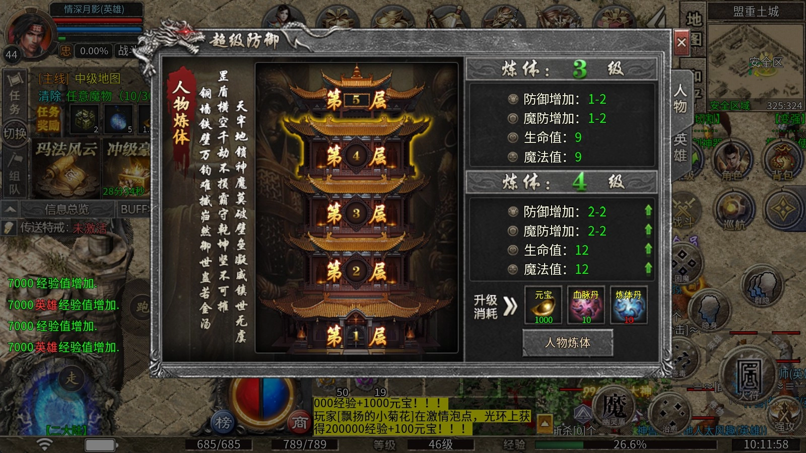 4、超级防御:消耗元宝、血脉丹和炼体丹升级,每一层都将获得大量防御属性。