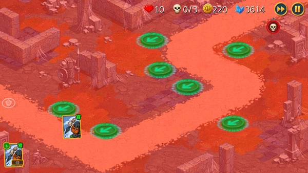 该游戏在基础的塔防玩法下没有什么根本性的变化,只有你能成功抵御怪物的路线入侵即可挑战成功,但游戏的独特性在于这里的防御采用了卡片形式,玩家们则需要根据已有的卡片来部署塔防,塔和炮塔代表战士,弓箭手保卫你的宝座。