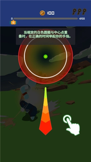 游戏的玩法很简单,点击下滑屏幕增加手中力量,这个时候会出现一个强大的冲气波,冲气波正中间有一个中心点。