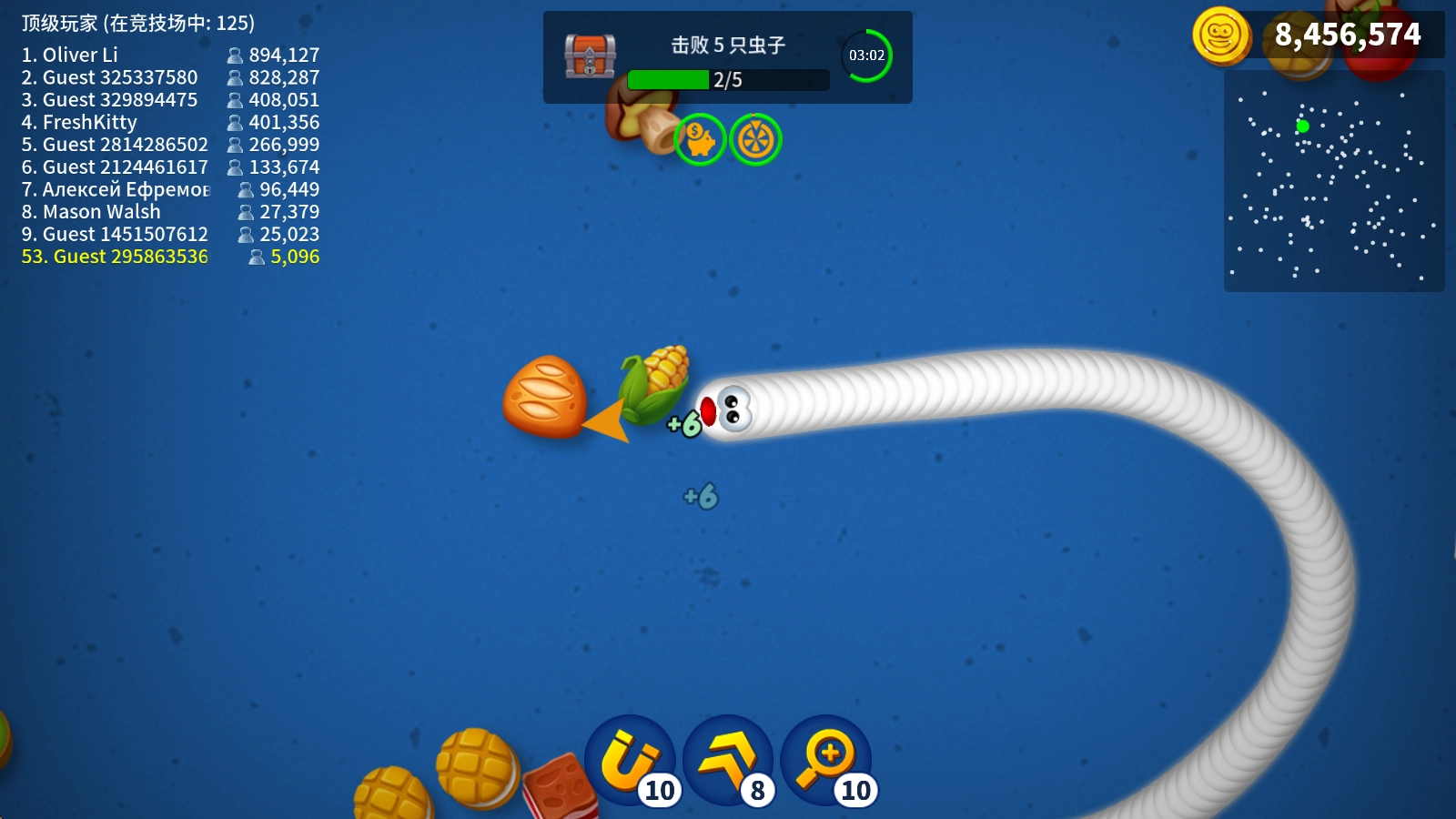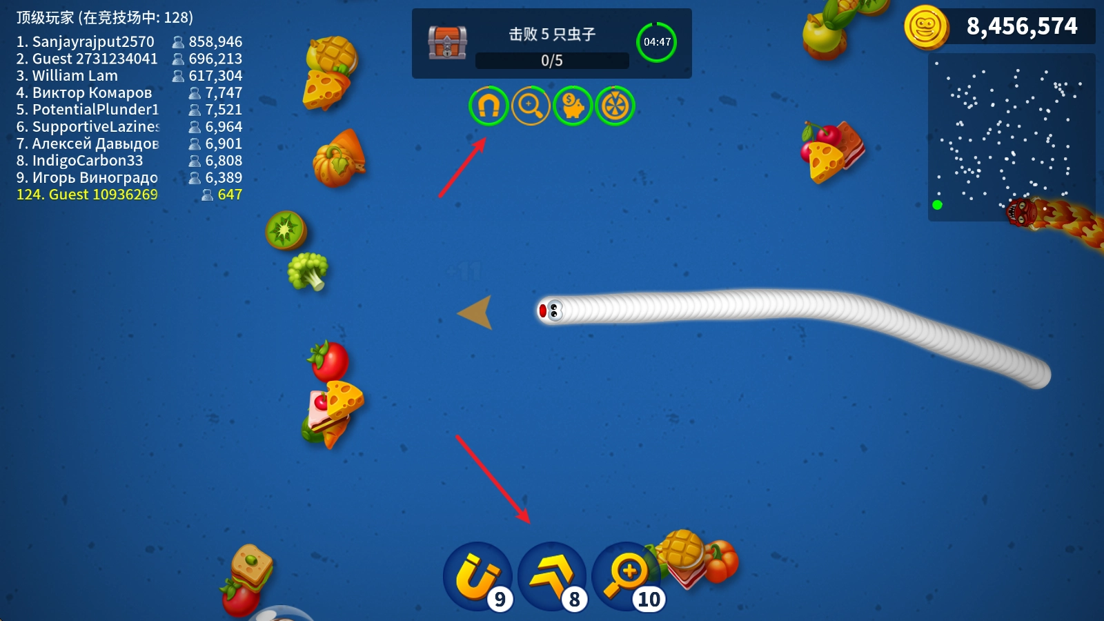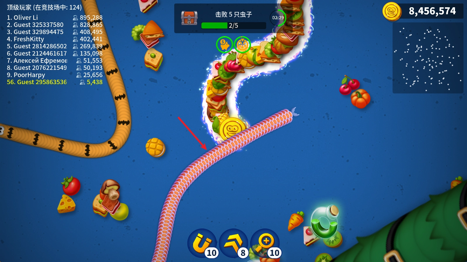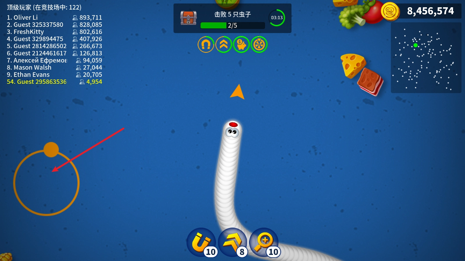 2、操控蠕虫寻找食物,靠近即可食用,增加自己的长度。