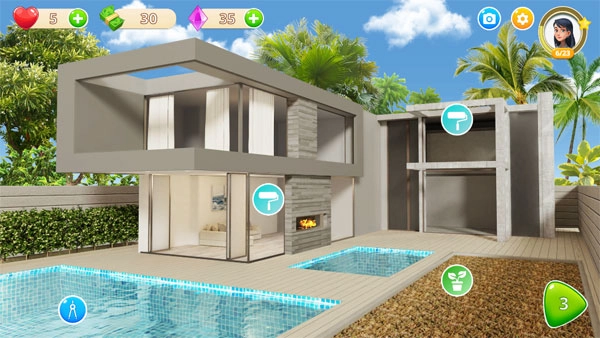 3、回到建造场景,选择不同装饰材质,对别墅、泳池等进行美化,打造个性化房屋外观。