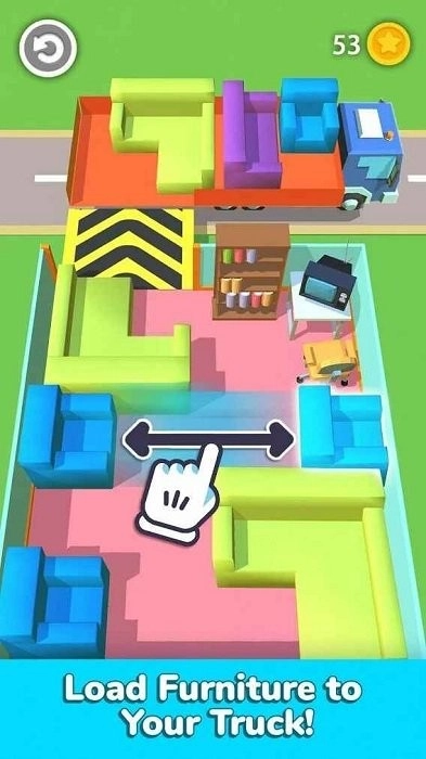 2、玩家需将沙发、电视、冰箱等物品从旧家搬到卡车上,再驾驶至新家并合理摆放,体验“拎着家具过马路”的趣味。