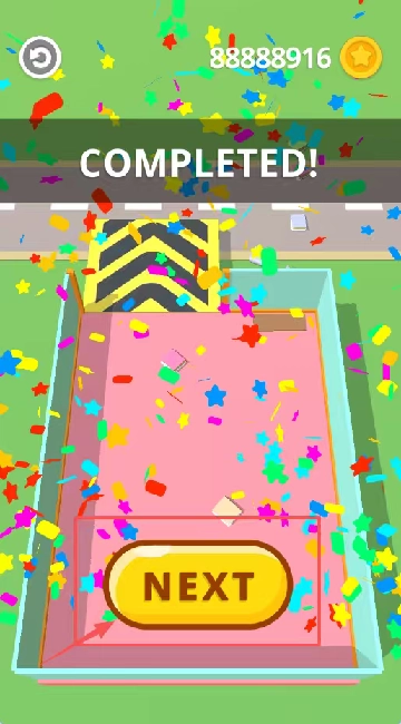 3、关卡完成后点黄色NEXT按钮,领取奖励进入下一关继续搬家。