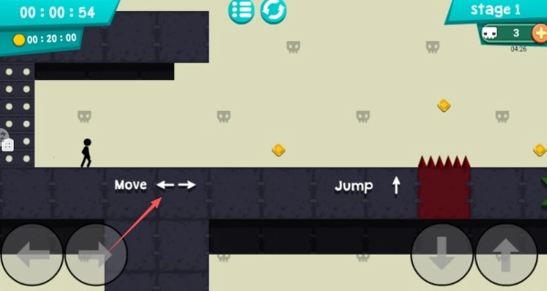 2、点击左右箭头,控制角色前进或者后退,向上滑动,控制角色进行跳跃。