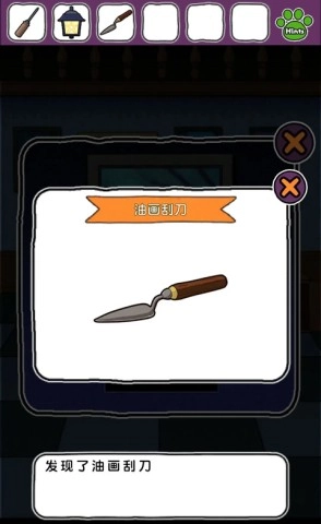 12、现在回到最初的房间,使用螺丝刀卸下左侧的吊灯。接着向右移动至有红色沙发的房间,点击第一幅画,卸下铭牌,你将获得一个刮刀。