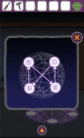 24、记住花瓶上的颜色分布,向右查看魔法阵,结合之前的提示从蓝到蓝,得出密码顺序:左上下右左,完成解码。