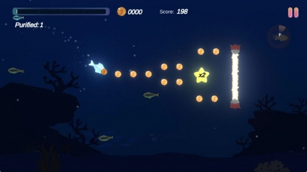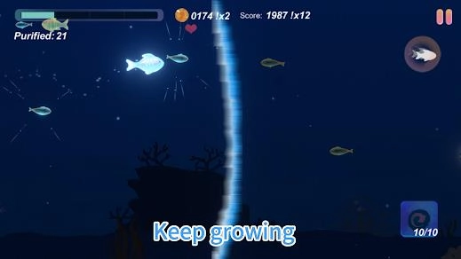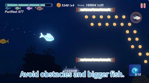3. 只要靠近体型比自己小的小鱼,便可实施“净化”,净化一旦成功,不仅能获取额外分数,还能得到特殊奖励,与此同时,小鱼的等级也会提升。1、通过点击屏幕控制小鱼的上下游动,灵活避开障碍物。