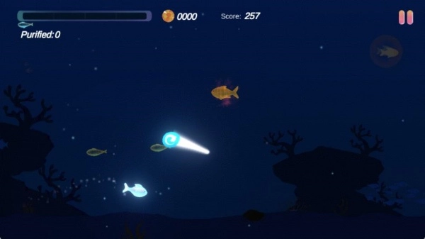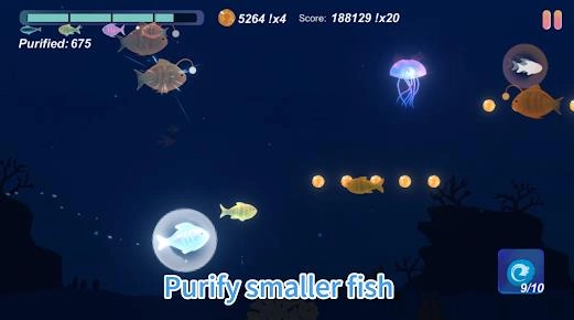 3、靠近比自己小的小鱼时即可进行“净化”,获得额外的得分和爽快感。
