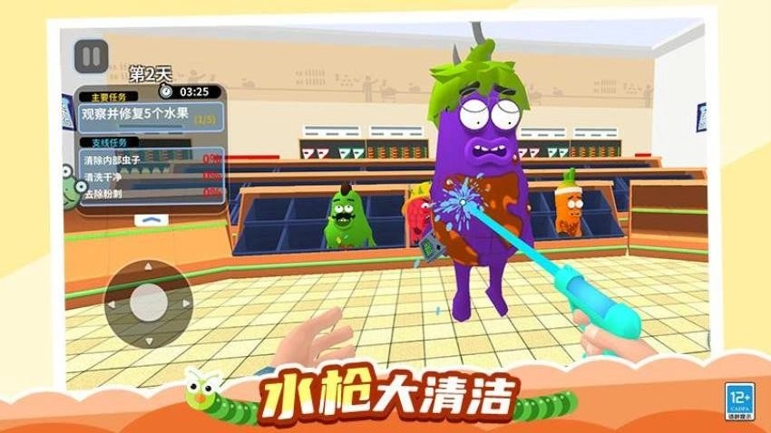 1、当生病的水果小怪来到你的诊所,你要先用特制镊子精准捉出藏在它们身体里的虫子,看着这些小害虫被夹走,水果小怪们仿佛都松了口气;