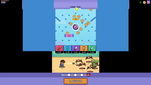 2.当金币从屏幕顶部滚落的时候会随机下坠,激活不同的武器,并提升武器的等级。