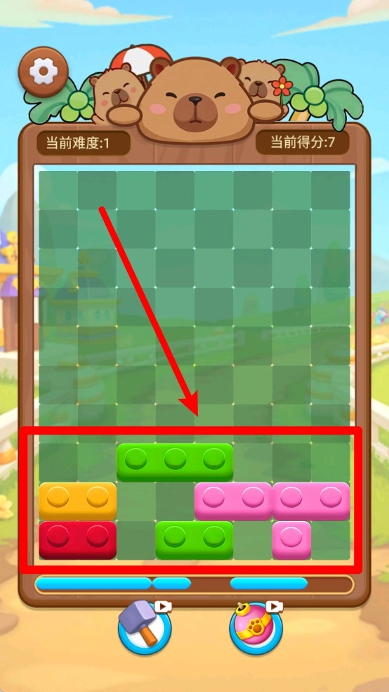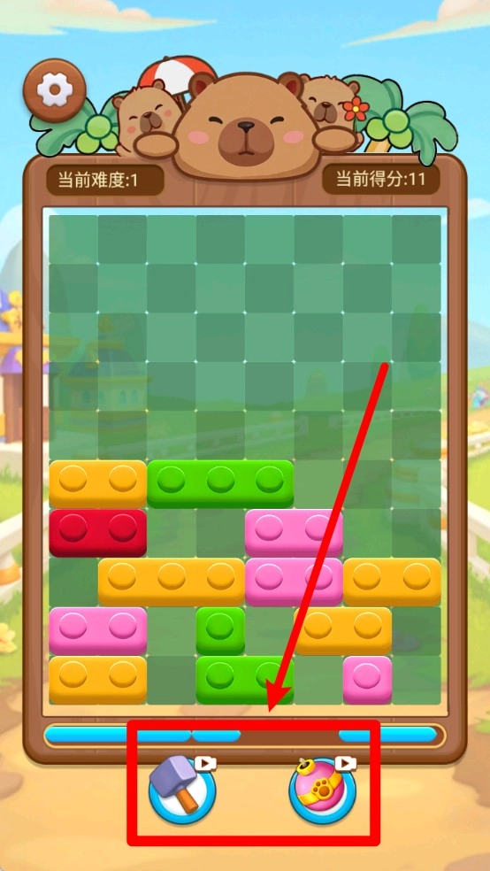 2.点击锤子道具可移除不需要的方块,点击炸弹道具可刷新当前可用的积木组合。