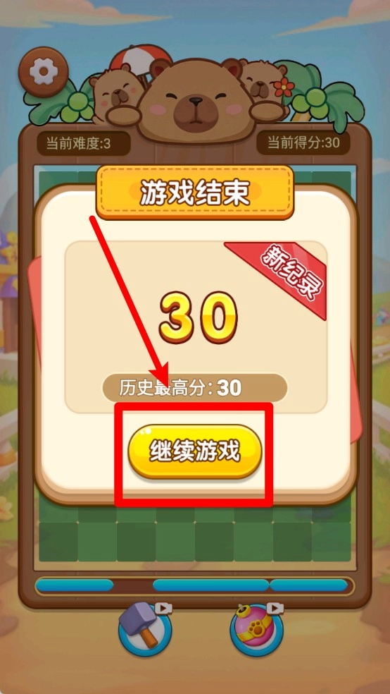3. 当棋盘上再也不能放置任何方块时,游戏即宣告结束,此时可点击“继续游戏”按钮,继续进行游玩。