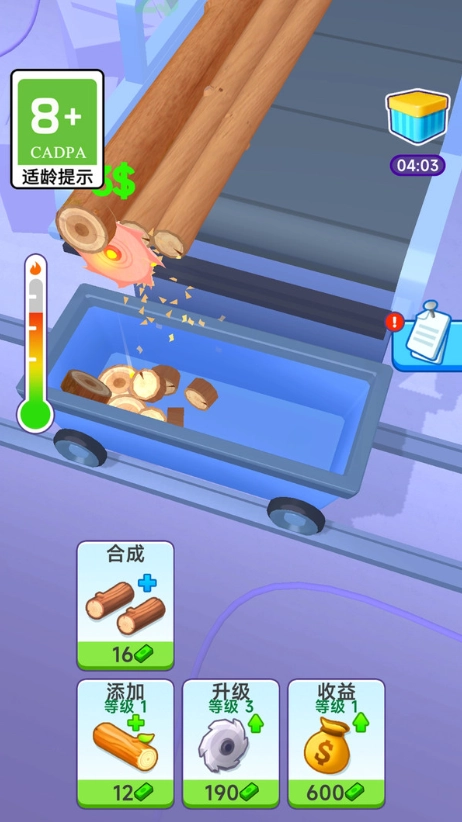 3、加工完成的木料会自动收集,获得的金币可用于升级锯片/解锁新木材/优化生产线速度。