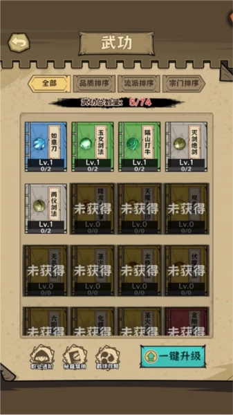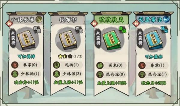 2、得到新的武功秘籍时,可以解锁该武功,再获得相同武功秘籍,可以提升该武功的等级,使其威力增加。