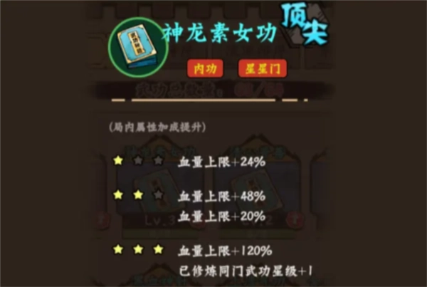 搭配原理:前期羁绊属性集中在少林派增加血量上限和昆仑派百分比回血,保证自身血线,同时利用拳掌的攻击伤害加深进行输出。中期获得蓝色神通“神龙素女功”之后优先升3星即流派大成,本阵容利用少林和内功带来强大的血上限+“3星内功”带来的所有已学习的同门派武功星级+1从而获得胜利。