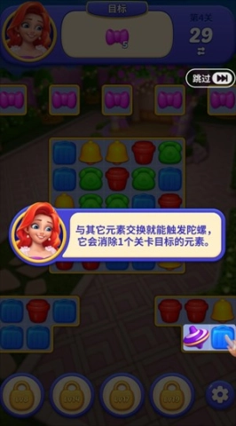 5、四个相同颜色的元素若是排成田字形,就能合成陀螺,与其他元素交换后可消除一个关卡目标的元素。
