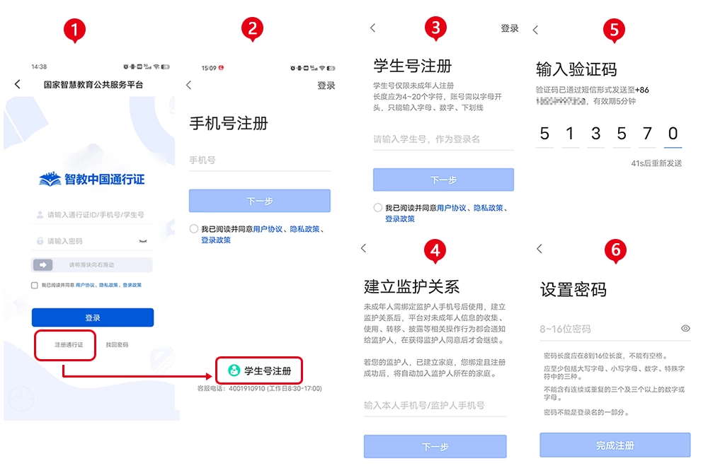 3、关联家长/监护人手机号,填入短信验证码,按照要求输入密码。