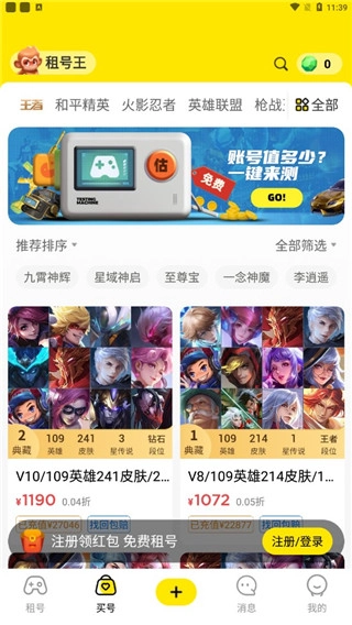 租号王,是一个集网络游戏账号租用与买卖的综合服务平台。平台内游戏账号种类繁多,租用方式完善,操作界面简洁。像和平精英、火影忍者、英雄联盟等热门游戏账号,都能免费使用。