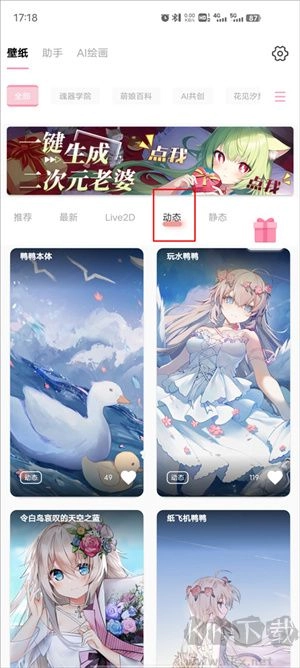 1. 开启傲娇壁纸,轻点底部的“动态”选项。