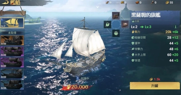 1、玩家通过完成主线与支线任务获得资源,用于升级船只、招募船员或购买装备。