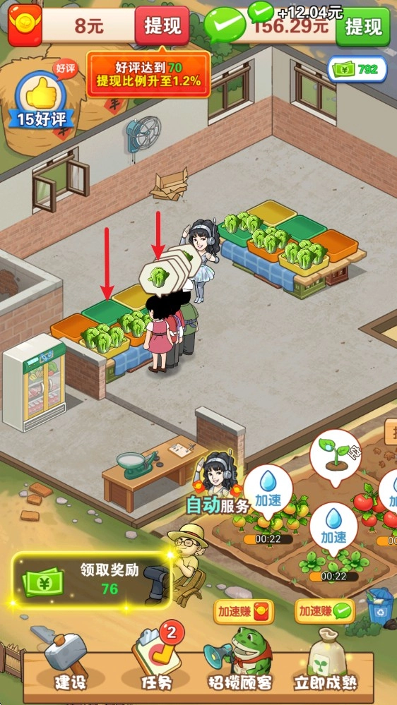 3、收获后的货源将会放到菜市场当中,点击客人头上的图案即可进行销售。
