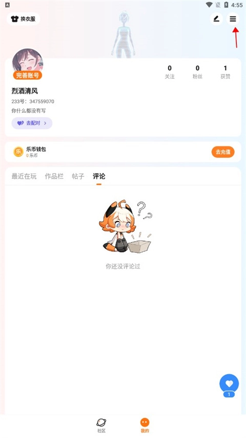 1、进入233乐园,点击我的,点击右上方按钮所指地方;