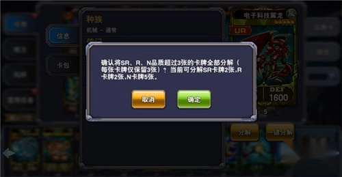 4、系统提供便捷的【一键分解】功能,可自动筛选并批量分解SR/R/N品质中持有量超过3张的多余卡牌。