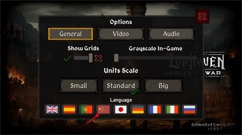 2、在设置界面的language一栏里选择中国国旗就可以将游戏设置成中文版。