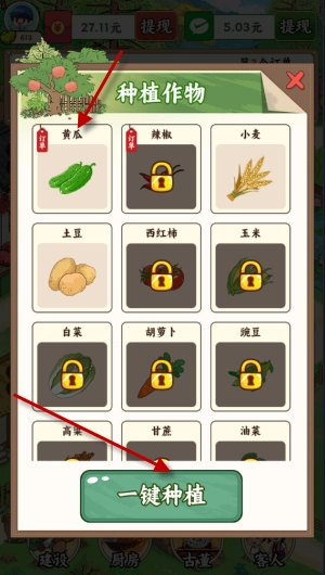 2、接着点击空余的土地开始种植,点击对应作物即可种植,也可以直接选择一键种植。