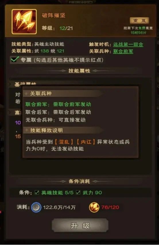 2、伤害技能多到让人眼花缭乱,技能是有学习条件的比如破阵摧坚学习要求是武力打到90,这个技能就适合武将和全才,然后技能的触发时机为远战第一回合,也就是说远战第一回合才会发动该技能,关联兵种前军,就是需要前军存在的时候且不被控制才可以发动,这个还是比较好理解的。