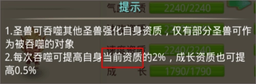 每次吞噬可增加当前宠物2%资质,注意,是当前资质。所以吞噬应当放到最后吞噬。就是当你的宠物进阶完、吃了10个天灵丹,天伤之魂点满,宠物觉醒多加的20次进阶也用完之后再吞噬最好。