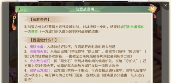 1、仙盟战比赛形式更改为攻城战形式2、对战双方需要守护自己城门,破坏对方城门3)通过战胜场景中刷出的“火石窃贼”或者拥有“陨火石”的敌方获得陨火石,提交陨火石来激活仙鼎炉向对方城门发射攻击,降低对方城门耐久4)通过驻守队伍驻守可恢复城门耐久,结束时依据双方城门耐久度判定胜负仙盟战的基本规则如上所述~~仙盟战结束时,城门耐久度高的仙盟为胜利的一方仙盟战结束后,场上会出现胜利宝箱,胜利方可捡(小编心得:活到最后有奖励,如果队伍实力较弱,建议临近结束时,解散队伍,避免整个队伍被击出比赛场地)