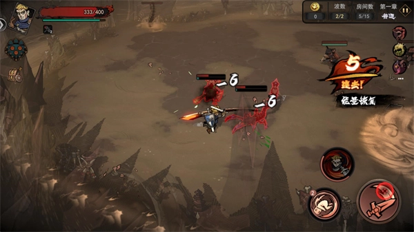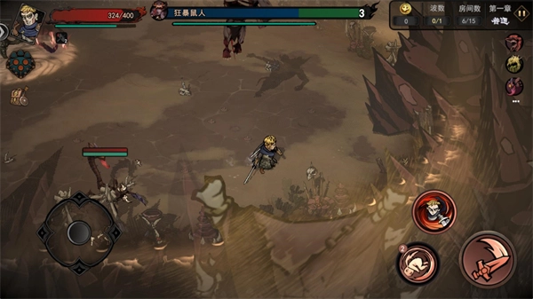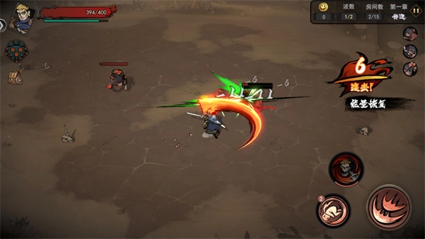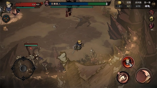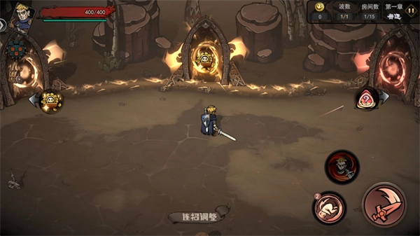 4、正式开始后左边控制角色移动,右边是攻击、翻滚和技能按键,移动角色进入不同的传送门开始闯关。