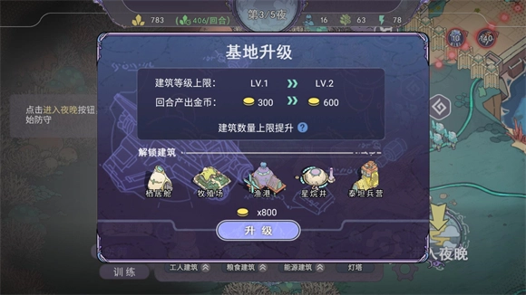 2、点击建筑可以对其进行升级,升级后的建筑提供的属性会更多,升级基地可以解锁更多建筑。
