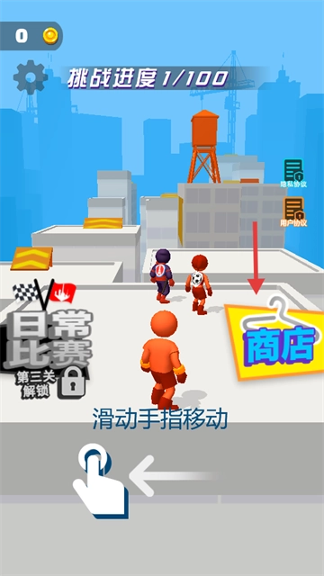 1、主界面按提示【滑动手指移动】-熟悉【商店】等功能-从挑战进度1/100起步推进。