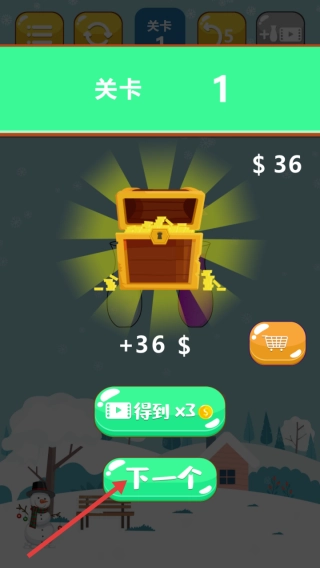 3、成功通关关卡后,点击绿色的【下一个】按钮,即可领取奖励并进入下一关。