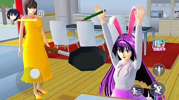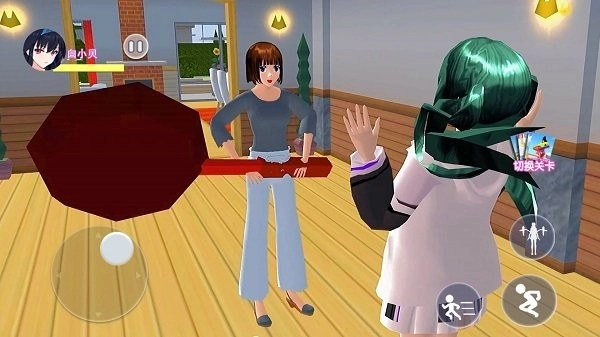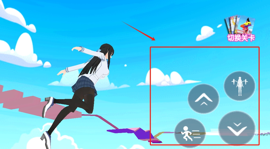 3、长按右下角方向按钮控制女生跑动,点击切换关卡按钮可进入不同场景。