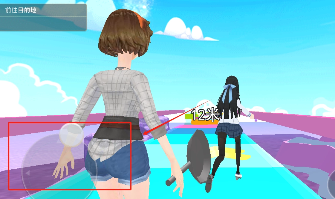 2、点击前往目的地按钮,操控短发女孩跑向12米外的长发女孩,注意距离变化。