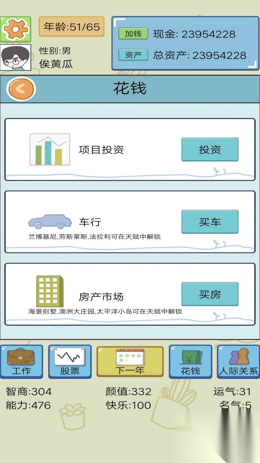 2、也能在 花钱板块进行项目投资、买车买房,管理资产,为角色带来如解锁豪车、房产等