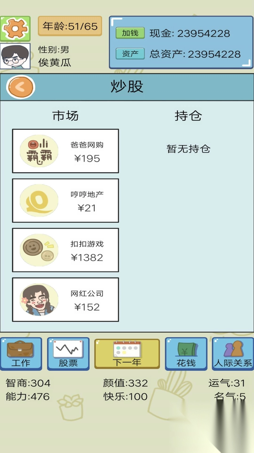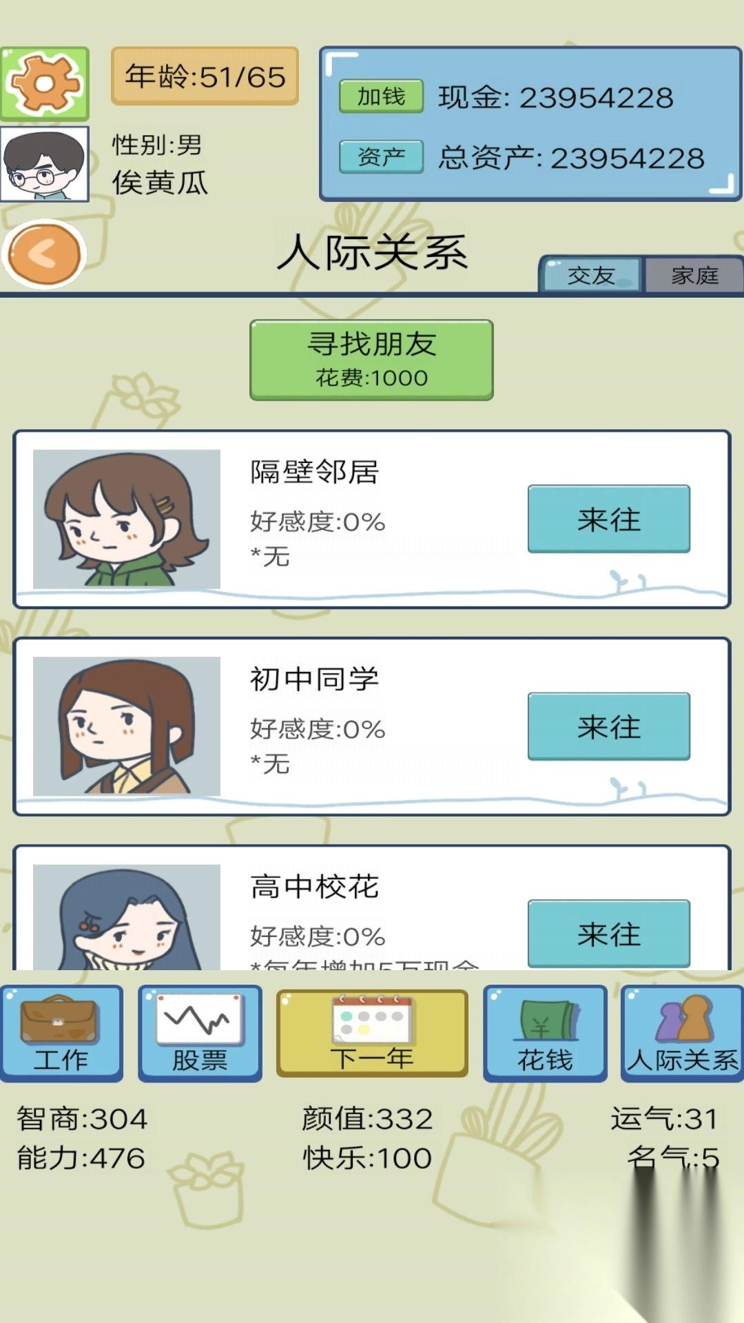3、人生事件随机触发,如进入名校攻读、获得工作收入等,不同选择和事件影响角色属性和财富积累。