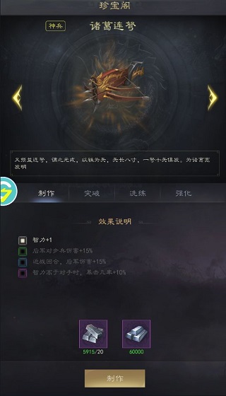玩家可以在珍宝阁中花费材料打造强大的神兵利器,加强己方的战斗力。