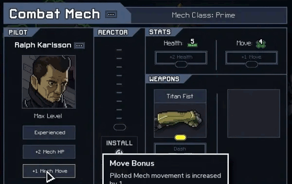 每台机甲都由一名机师操控,机师升级时会自动解锁被动技能。每次“战役”重新开启,你可以挑选一名已解锁至少一项被动技能的机师。对新手而言,Abe Isamu是个不错的选择——他能提升机甲的装甲,让直接攻击造成的伤害降低“1点”。游戏前期,Abe的机甲可以充当小队里的Tank,吸收怪兽的伤害,同时阻止怪兽对建筑物射击。要是你在策略上有所疏漏,Isaac Jones能给你一次额外的战斗“重置”(Reset)机会。另外,高阶机师需要“能力核心”来激活自身能力,这意味着他们得等到战役后期才能发挥作用,建议留给更有经验的玩家来指挥。