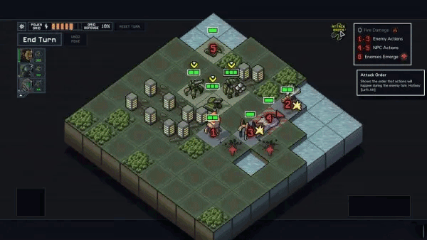 在《Into The Breach》的游戏机制里,HP应当被看作是为了赢得胜利可以消耗的资源。不必担心让机甲承受较低的伤害,为了守护人类建筑,这么做完全值得。另外,机甲的HP归零并不意味着它被彻底摧毁,只是暂时失去行动能力。要是有被动治疗技能,它们会在没有飞行员的情况下重启并继续参与战斗。失去“机师”(Pilot)或许会让你心里不好受,但损失一名机师并不会导致游戏直接“结束”。就算任务失败,也能把一名机师传送回另一条时间线,并且保留其所有的经验和已解锁的能力。因此,“培养、保护、继承”王牌机师就成了游戏的核心战略。由于每次只能传送回一名机师,小队里的另外两位机师基本上可以当作“易耗品”来使用。