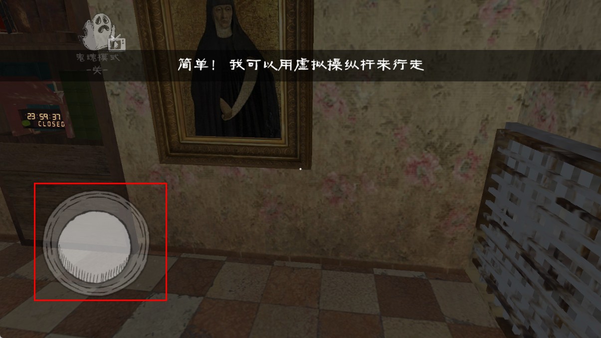 2、在室内场景,通过左侧虚拟操纵杆,可控制角色在房间内行走,探索不同区域,寻找线索。