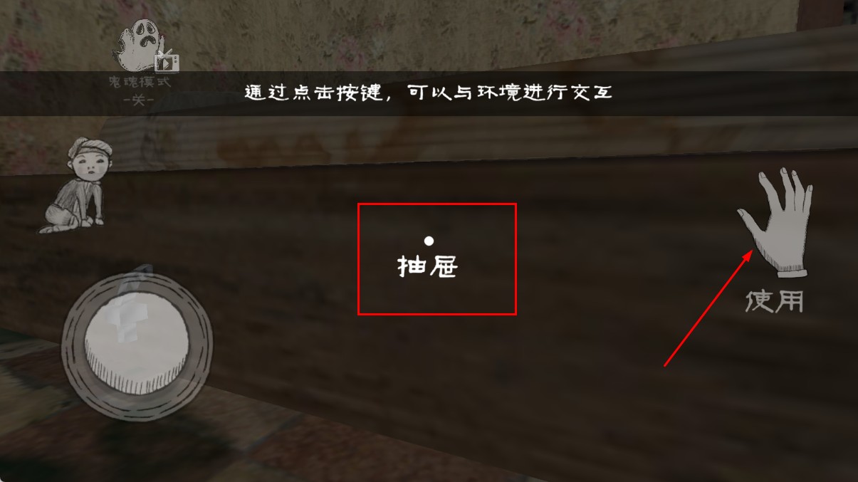 3、遇到抽屉等可交互物体时,点击右侧使用按钮,能与抽屉进行交互,尝试打开抽屉获取可能存在的道具或线索。