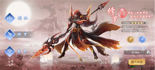 在游戏里,修罗属于物理输出职业,精通近战单体攻击,招式风格大开大合,兼具攻防能力。它还具备全职业中最为强劲的单体爆发连招,可冲锋贴近敌人,施展强力控制技能,是突破阵型、对抗敌人的得力角色,上手难度评定为四颗星。
